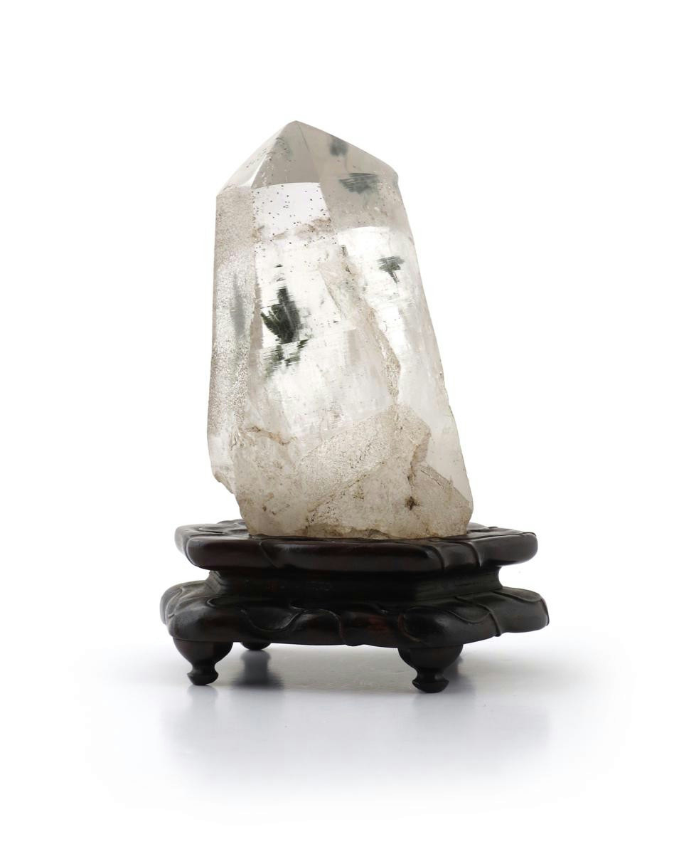 A Chinese rock crystal scholar's desk ornament, the stone with green crystal inclusions, mounted on a hardwood stand carved with swirling petals, 17cm. (2)