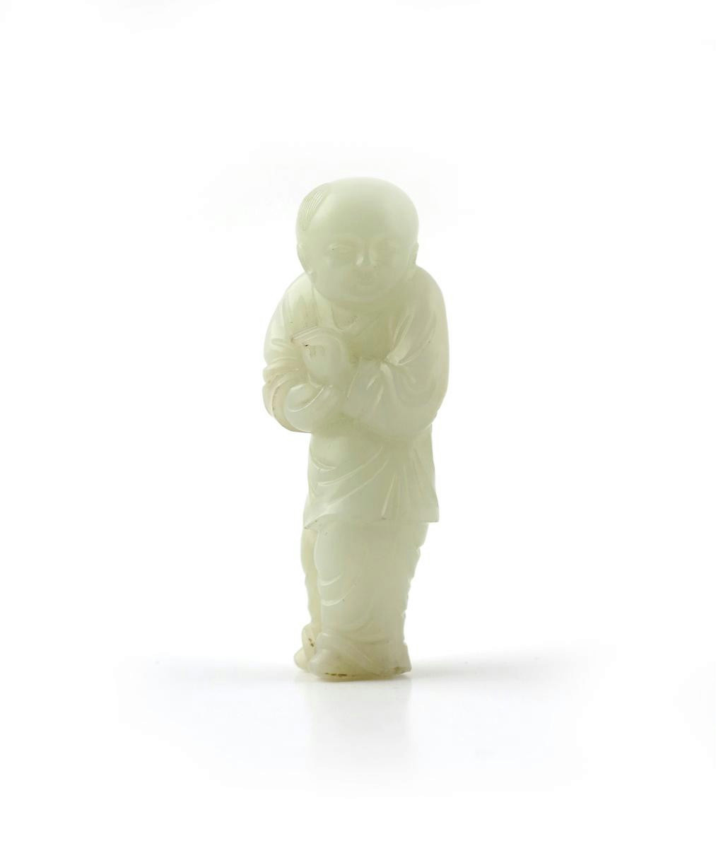 A Chinese pale celadon jade carving of a boy 18th century, standing with his head turned to the left, his hands before him as if holding a small object, 6.3cm.