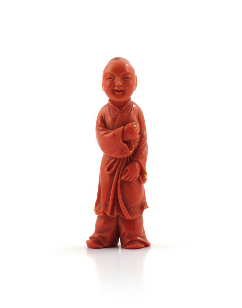 λ A Chinese coral carving of a boy 19th century, standing with his right arm across his chest, wearing a robe, 8cm.
