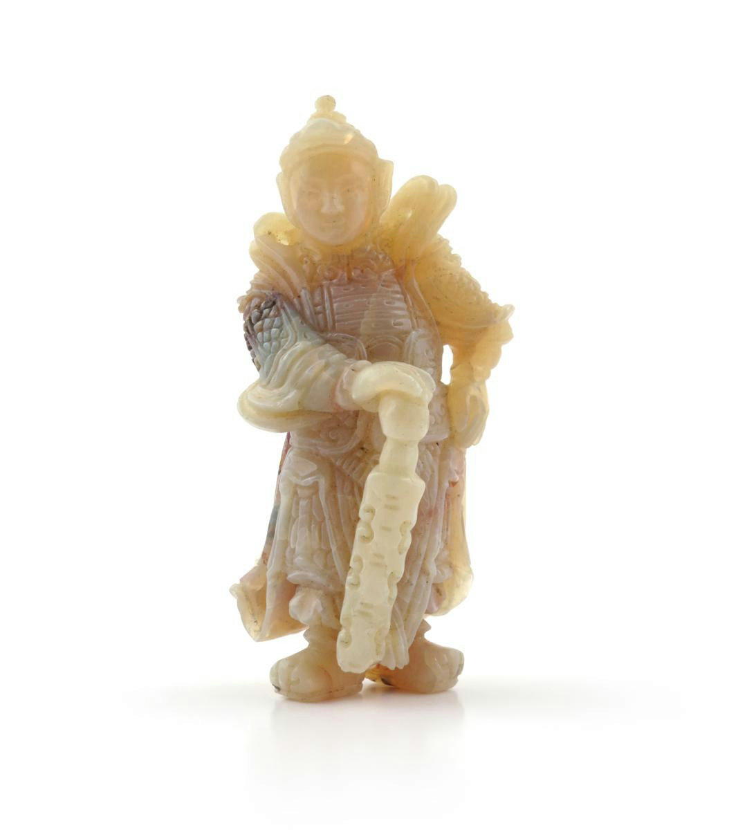A Chinese carved opal model of a warrior 19th/20th century, standing in full battle regalia, with his right hand on the pommel of his sword, 7.5cm.