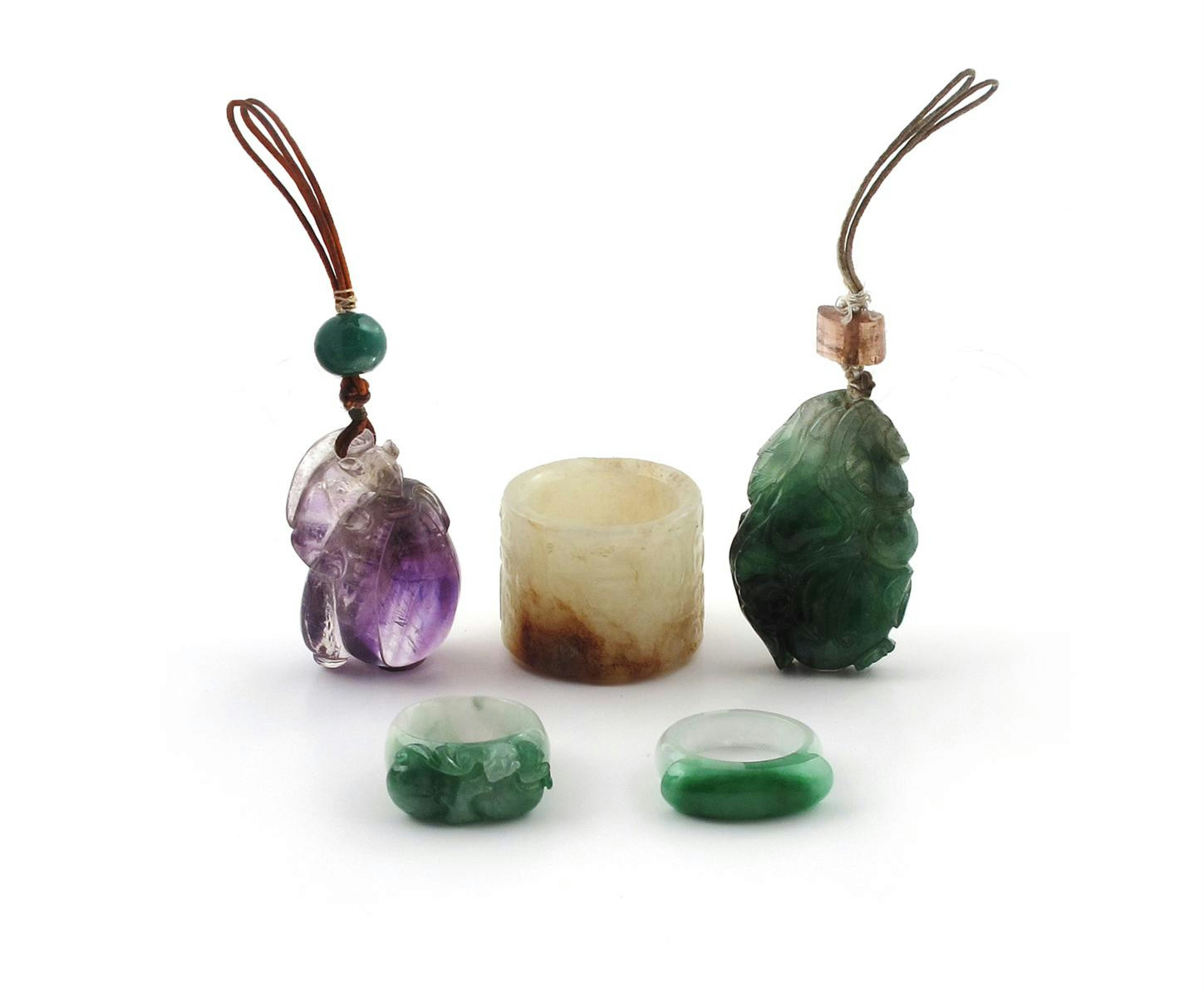 Two Chinese hardstone pendants c.1900, one jadeite, carved with a bat and fruits, the other amethyst, with a rat and two aubergines, two jadeite rings and a pale celadon jade archer's ring, carved with archaistic scrolls, 4cm. (5)