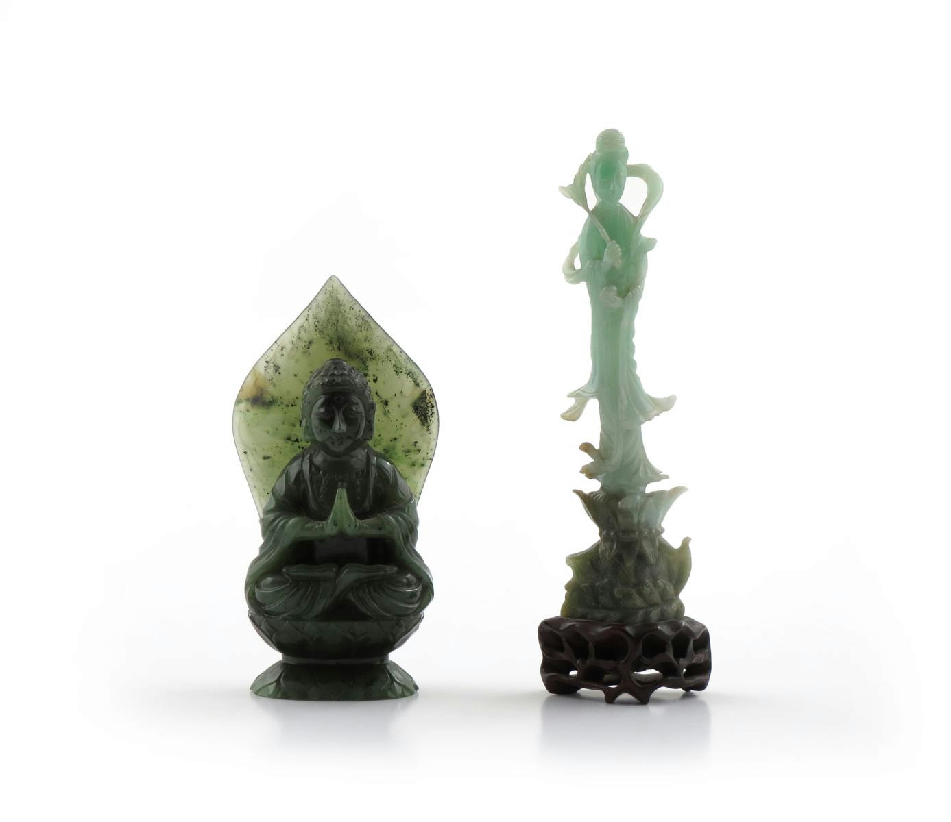 A Chinese jadeite carving of Guanyin 19th century, standing wearing billowing robes on a high double lotus base, holding a leafy branch, together with a spinach-green carving of Buddha, seated on a lotus base before a flaming mandala, the former mounted in a hardwood stand, 15.4cm. (2)