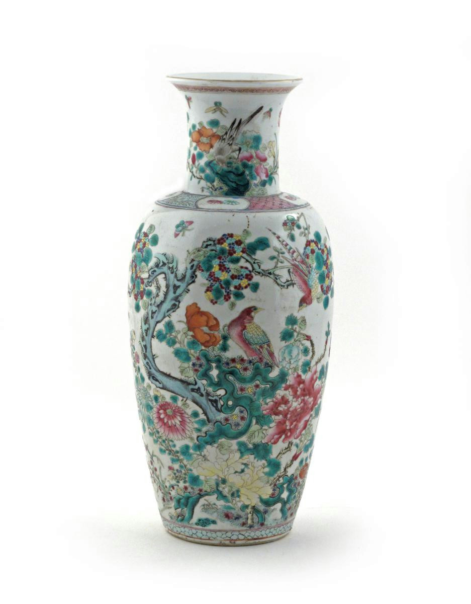 A Chinese famille rose vase 19th century, brightly enamelled with a gnarled flowering prunus emerging from rockwork with peony and chrysanthemum, with birds perched on branches and insects in flight, 44.5cm.