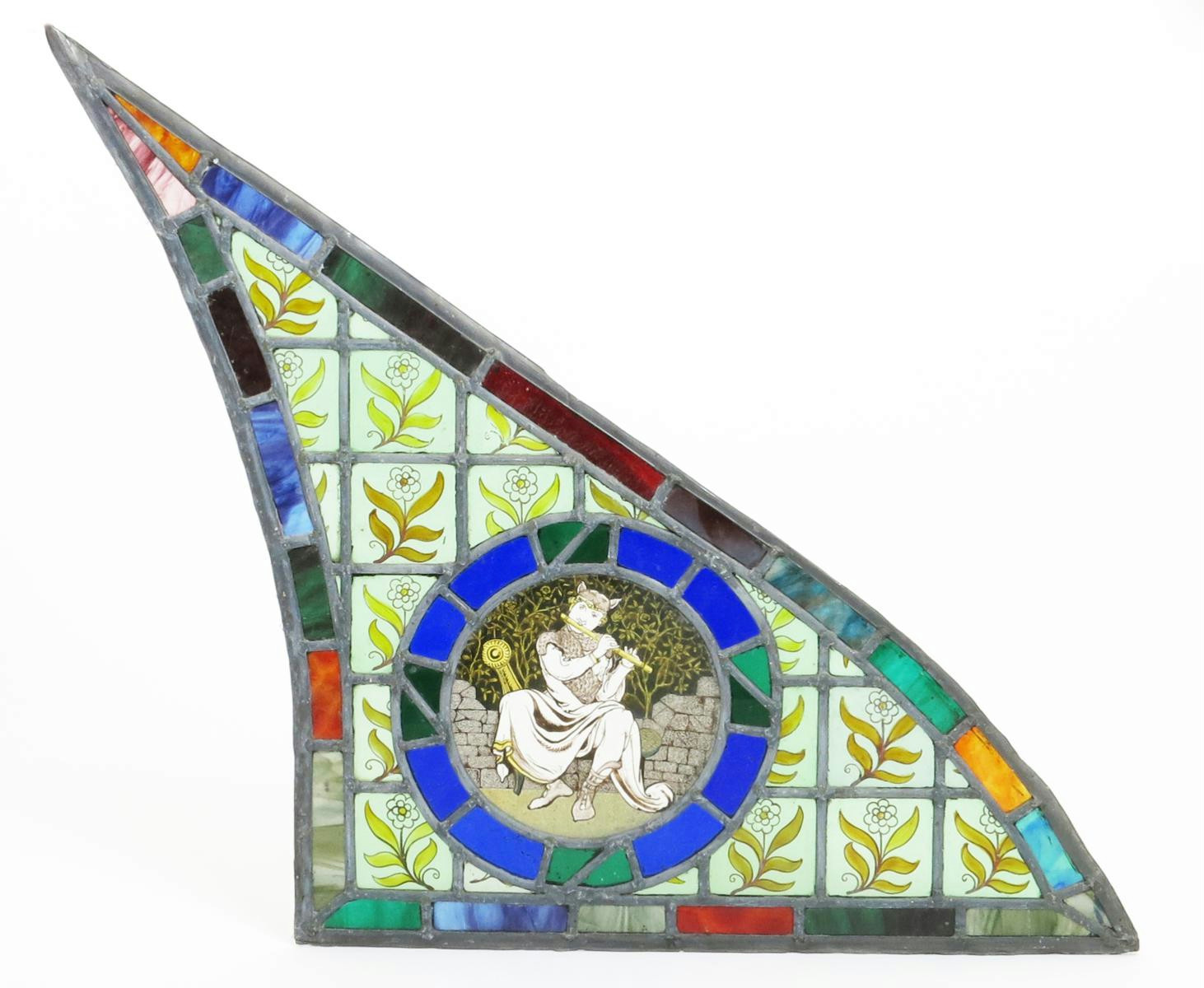 A pair of stained glass windows possibly William Ramsey the design attributed to John Moyr Smith, the shaped triangular windows set with circular painted panel of a seated piping figure, the other with a figure crouching and playing the cymbals unsigned 90cm. wide
