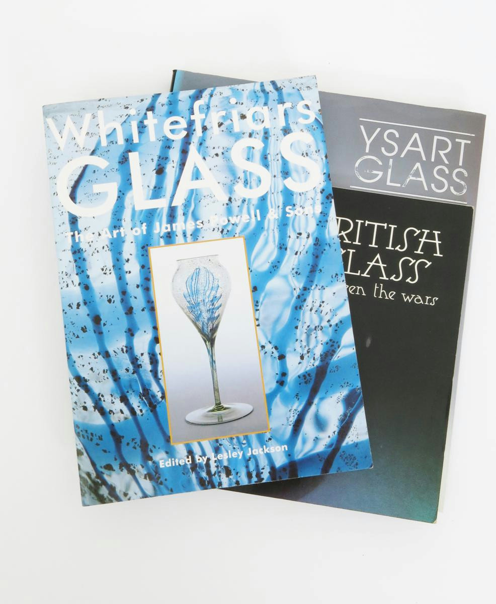 A collection of reference books on Arts and Crafts and 20th century design, including British Glass Between the Wars, Whitefriars Glass edited by Lesley Jackson, Ysart Glass, and Leerdam Unica 1923-1987 by Marc Hiermans , Charles Rennie Mackintosh by Thomas Howarth, The Dr Thomas Howarth Collection of Charles Rennie Mackintosh Christie's King Street catalogue, Liberty Design by Barbara Morris