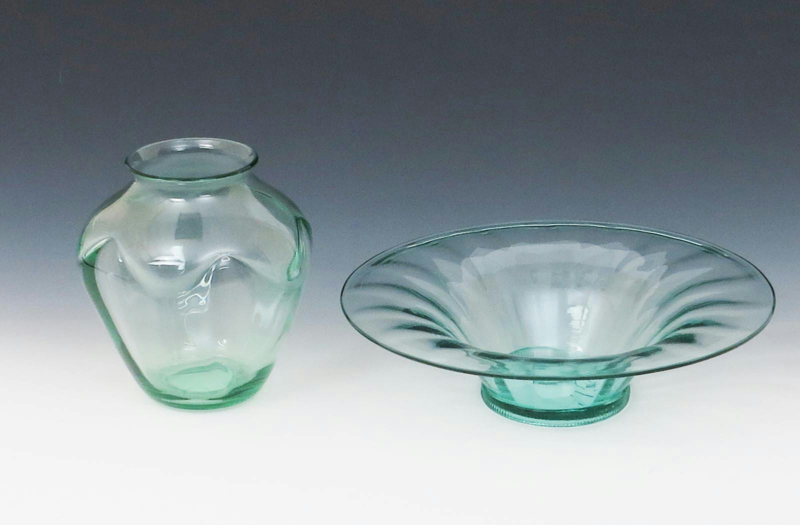 A James Powell & Sons Whitefriars emerald glass vase designed by William Wilson, shouldered form with applied swags, and a flaring emerald glass bowl, unsigned 19cm. high