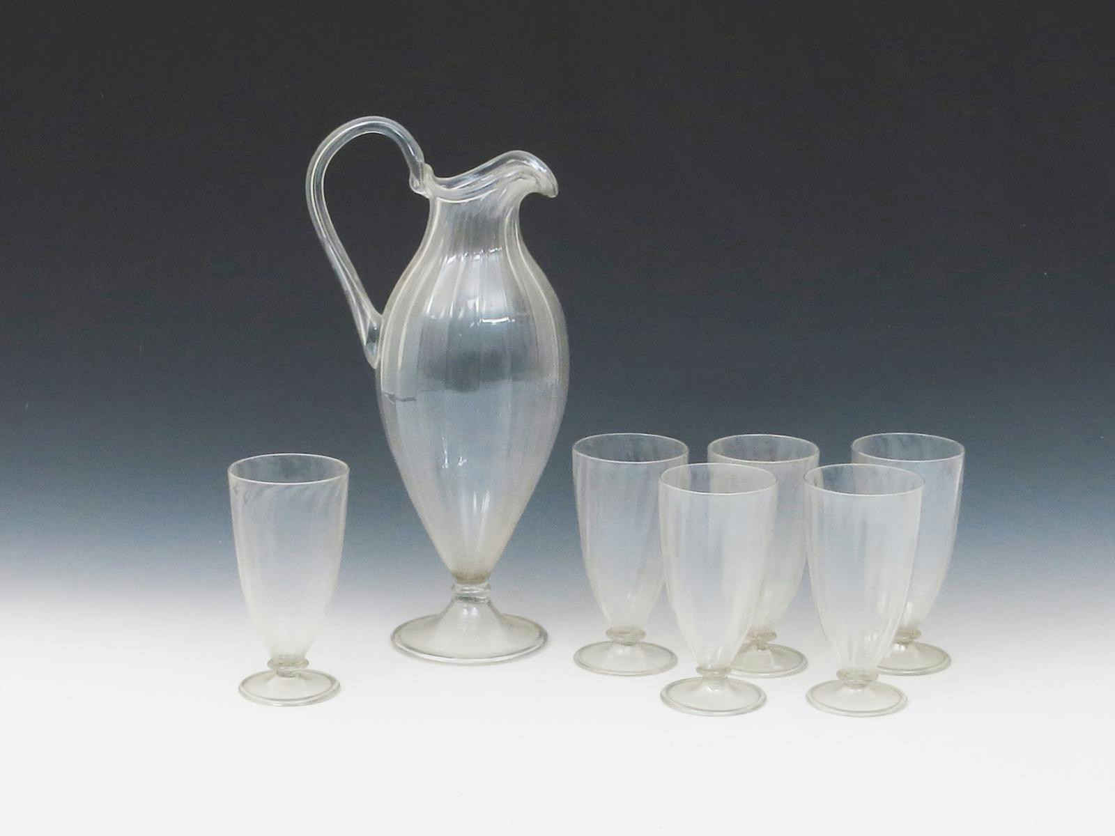 A fluted glass water jug and eleven glasses, probably Italian, the slender ewer with applied handle and foot 37cm. high