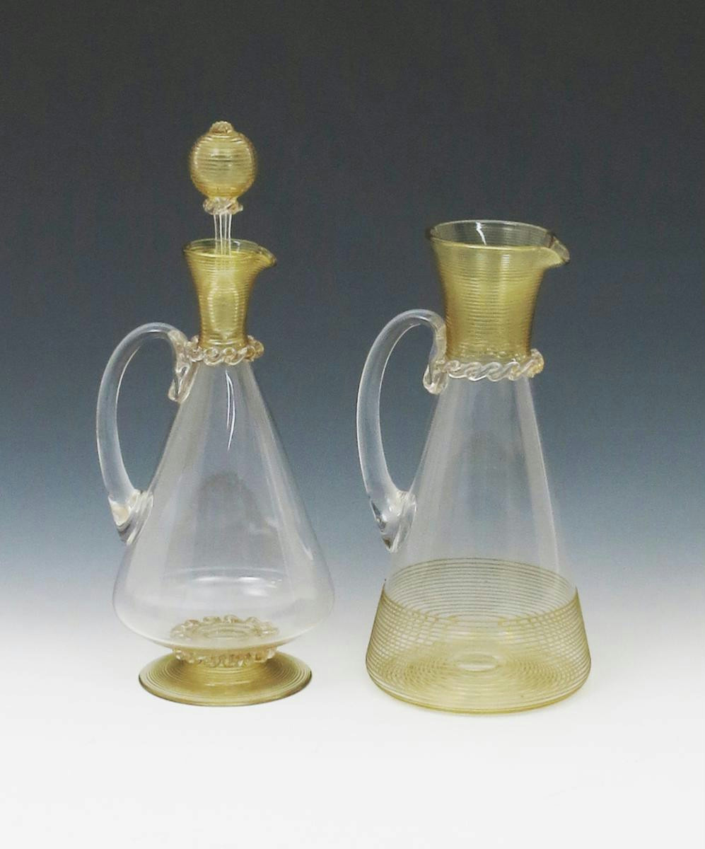 A glass decanter and stopper and water ewer, probably Stourbridge, clear glass with olive green threading bands and applied border to neck, unsigned 24.5cm. high