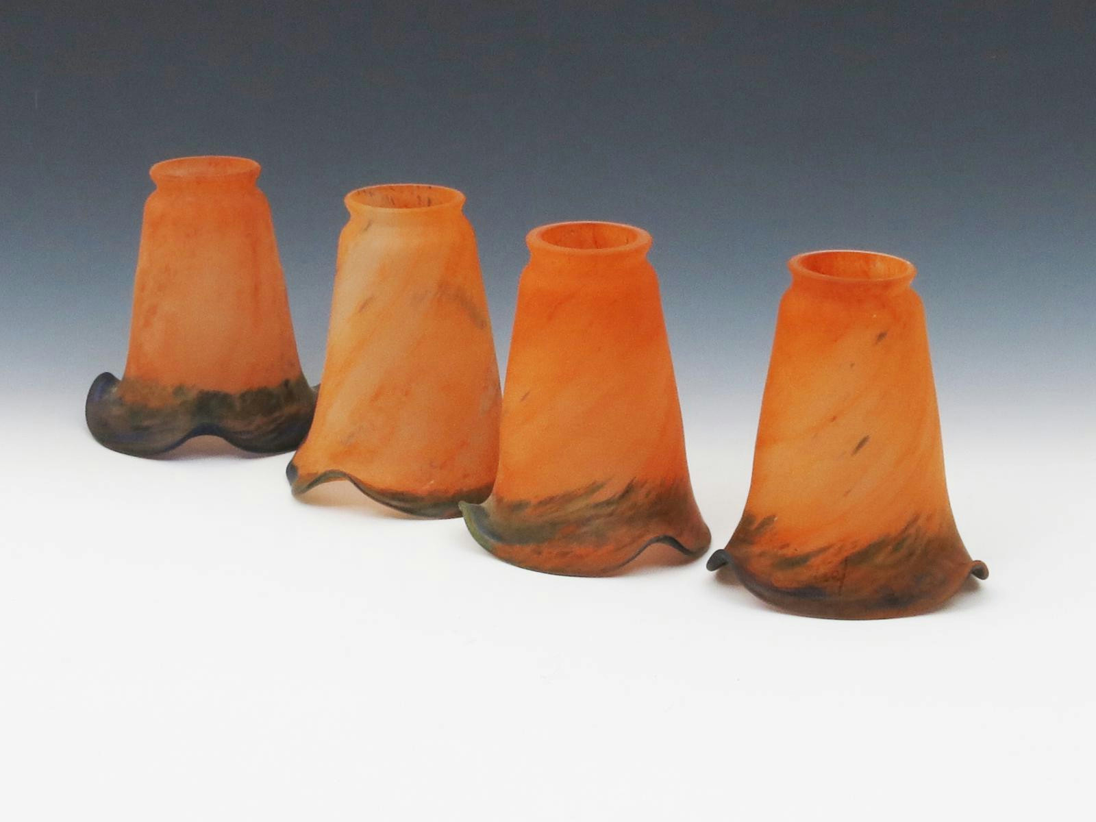 A modern set of four Tief glass shades, flaring cylindrical orange glass with pulled blue rim, and five clear glass shades acid-etched Tief 16cm. high