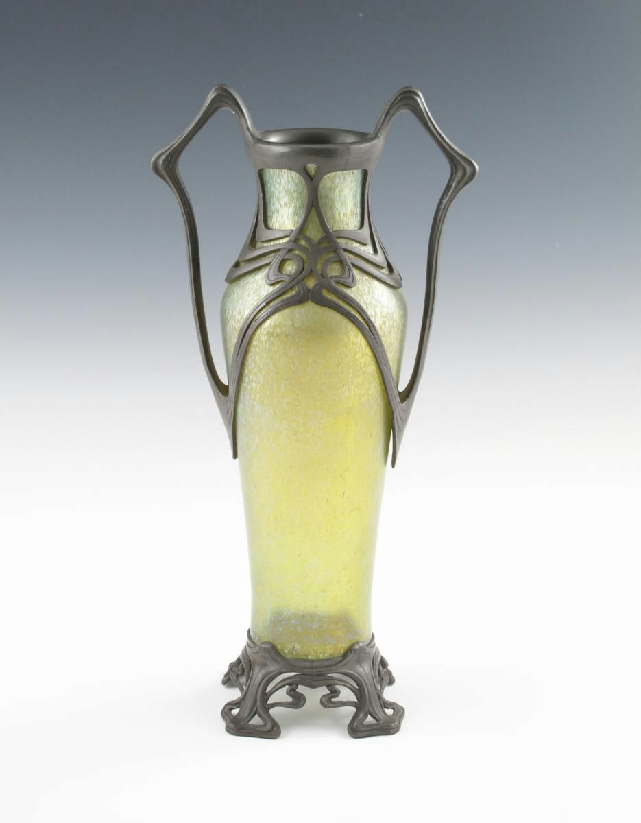 An Art Nouveau pewter mounted iridescent glass vase, the glass probably Loetz, slender, shouldered form with splashed iridescent surface, with cast twin-handled mount and foot unsigned 43cm. high