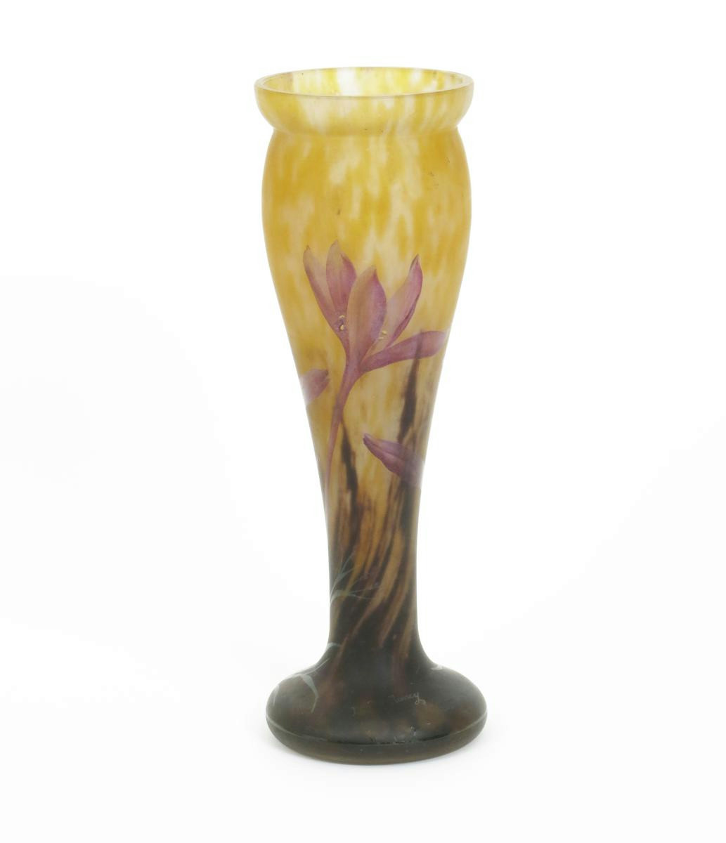 A Mado enamelled glass vase, painted with autumn crocus flowers in purple and green on a mottled orange ground acid etched Mado Nancy signature to foot 31cm. high