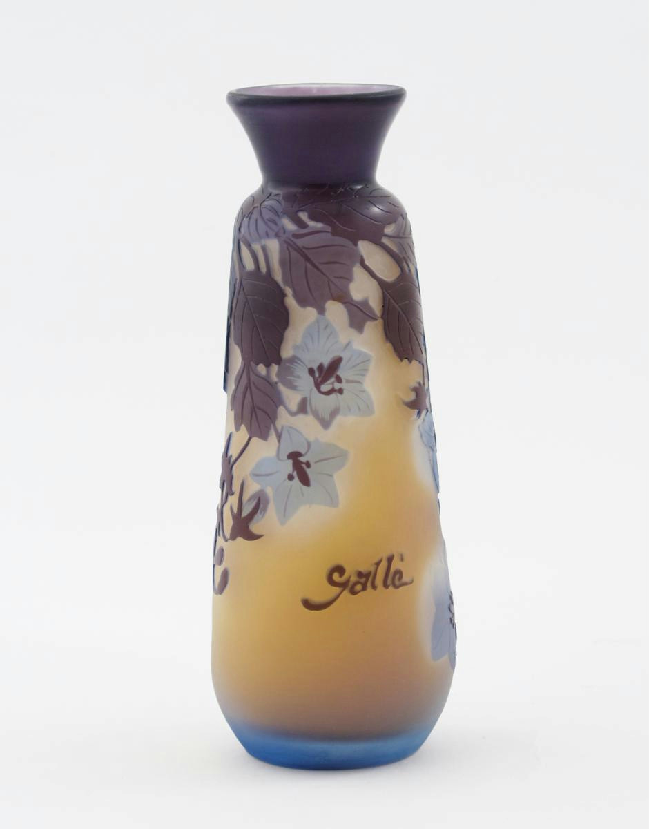An Art Nouveau Emile Galle cameo glass vase, tapering cylindrical form with everted rim, amber glass with purple overlay decorated with pendulous flower stems cameo Galle signature 16cm. high