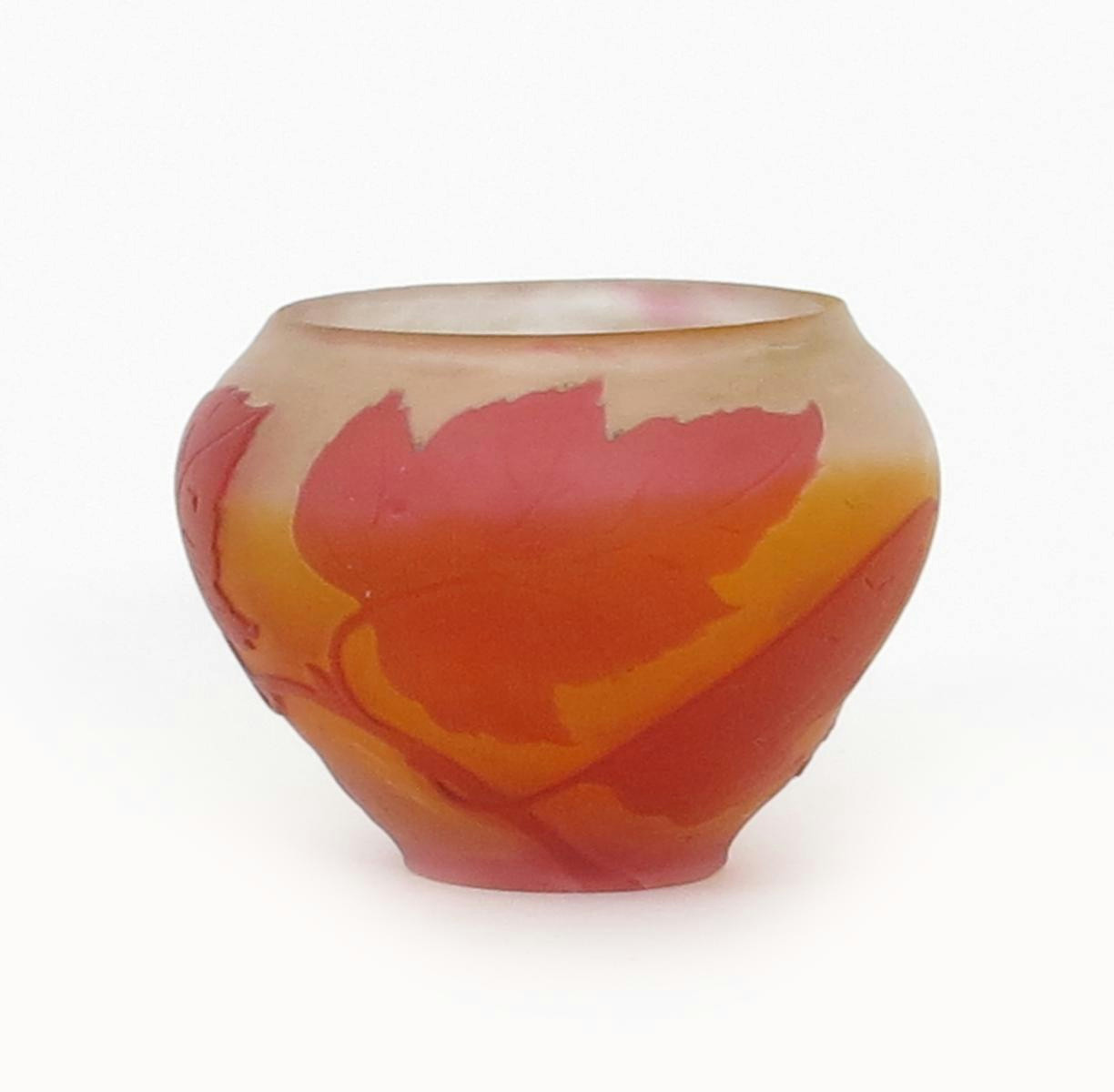 A small Galle Art Nouveau cameo glass vase, compressed form, red overlay glass decorated with berried foliage bough, over orange and opaque glass body cameo signature Galle 5.5cm. high