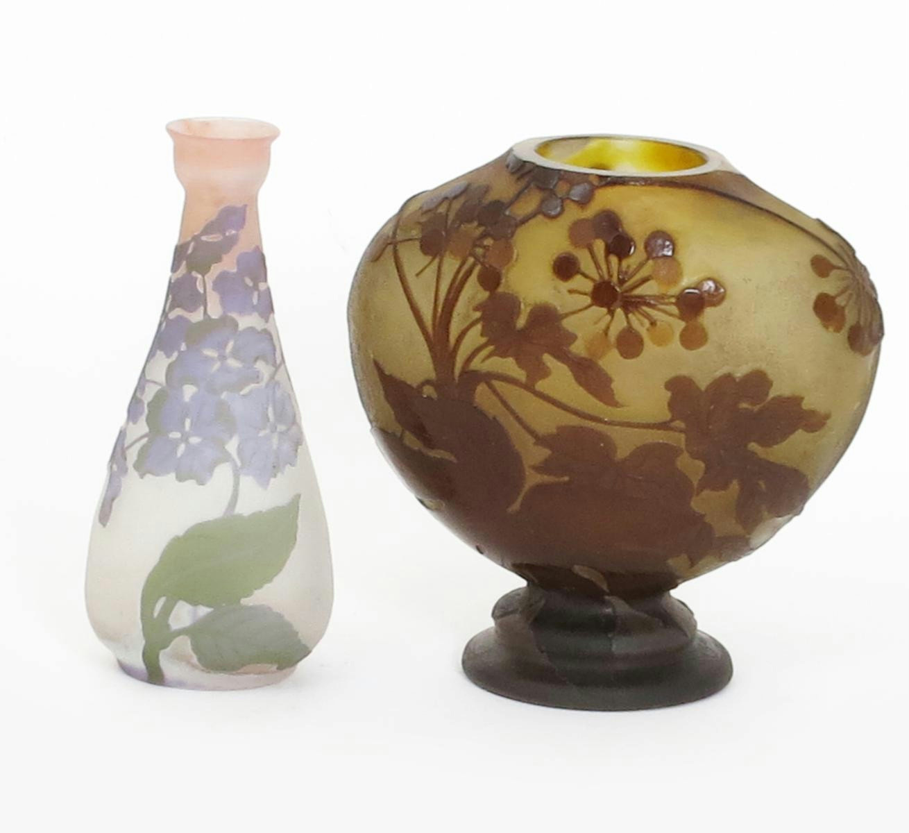 An Art Nouveau Galle cameo glass vase designed by Emile Galle, tapering bottle form with knopped neck, pale pink body overlaid with green and white honesty stems, and another Galle cameo glass vase cameo signature to both, second vase reduced neck,18.5cm. high