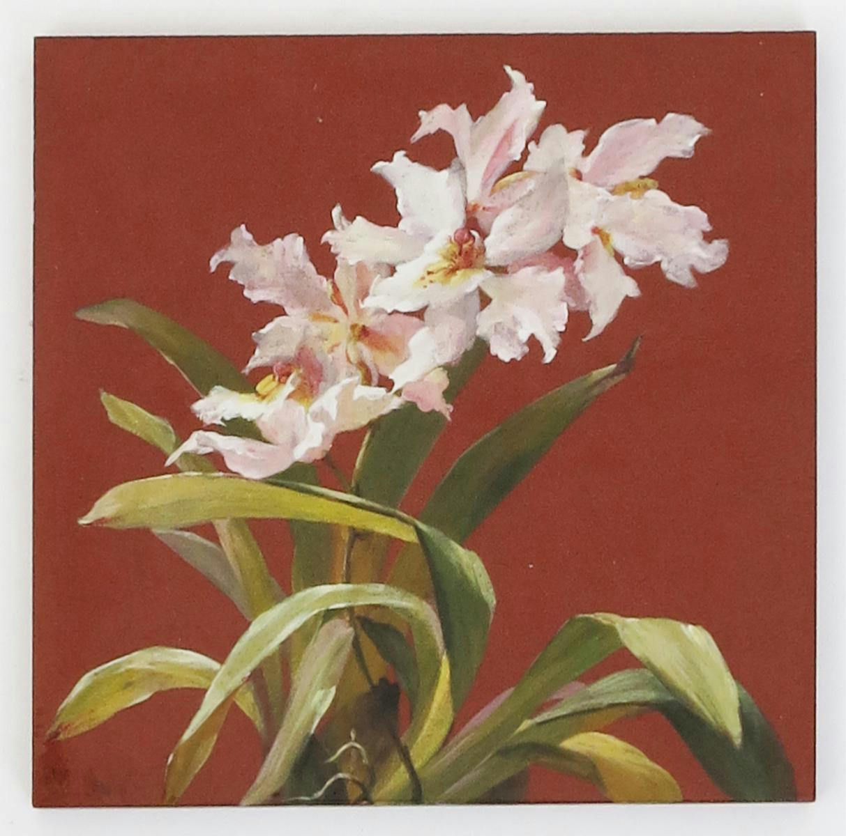 A Minton's Pottery tile by William Mussil (1828-1906), painted with an orchid spray in colours on a terracotta ground impressed marks, painted signature to front 20.5cm. square