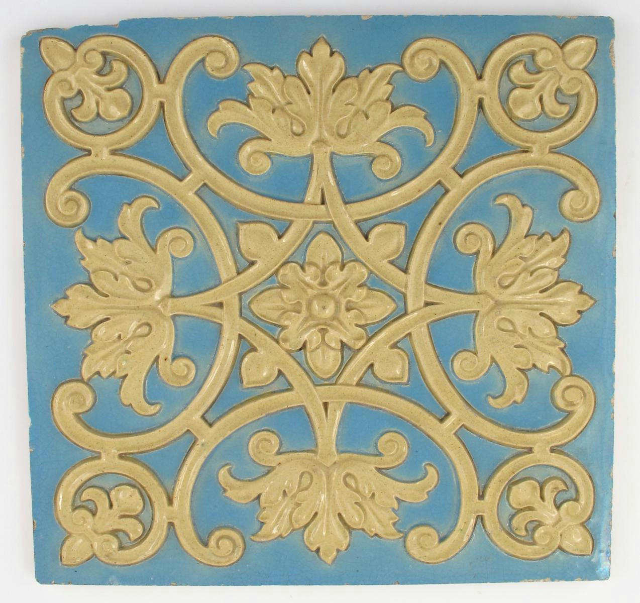 A large architectural tile, attributed to the Leeds Fireclay Company, cast in low relief with scrolling formal flowers and foliage design in sand on a sky blue ground unsigned 39cm. square