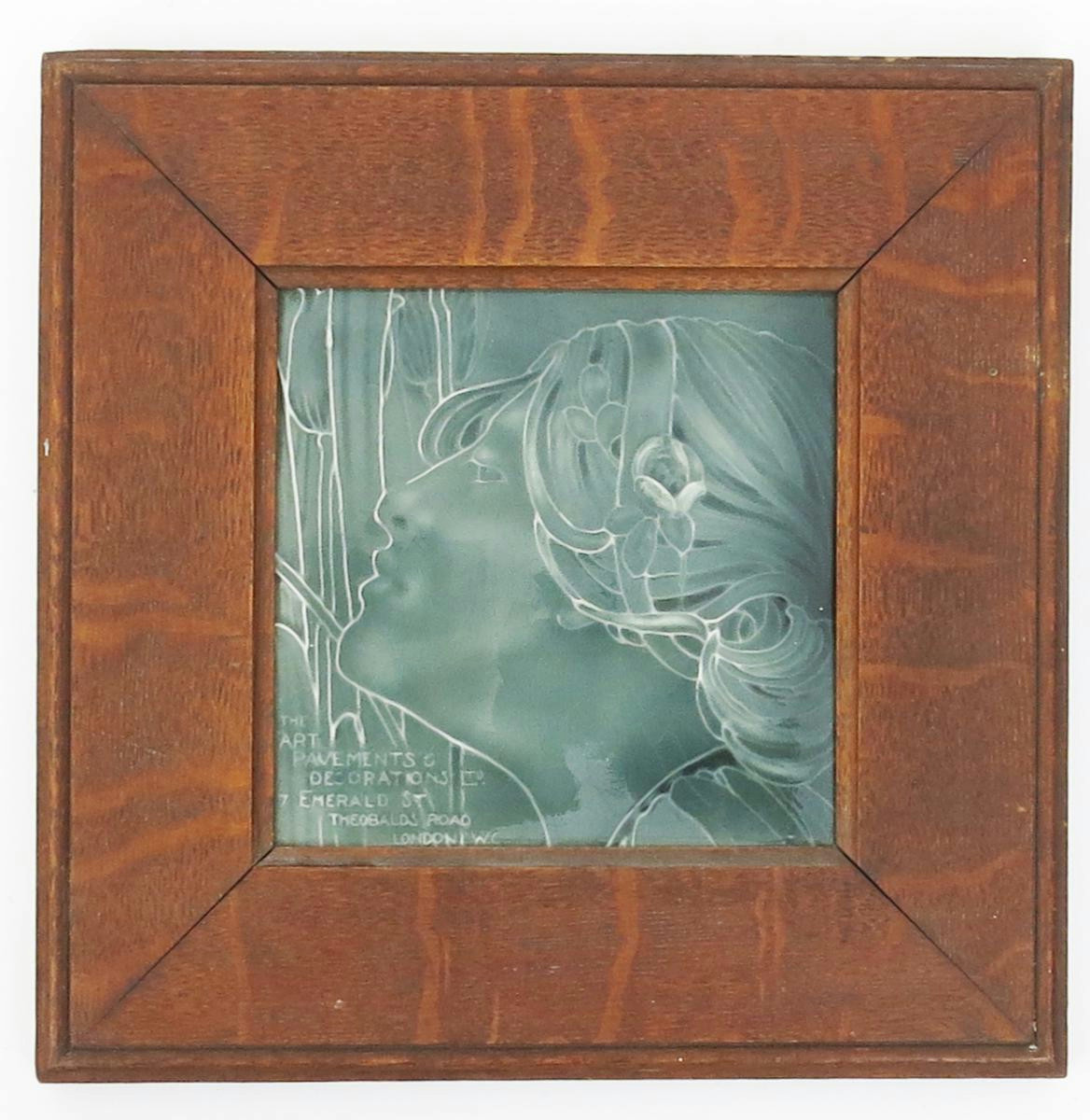 An Art Nouveau advertising tile by Eleanor Fortescue Brickdale, decorated with a maiden in low relief smelling a flower's scent, glazed blue-green, framed, inscribed The Art Pavements & Decorations Ltd 15cm. square
