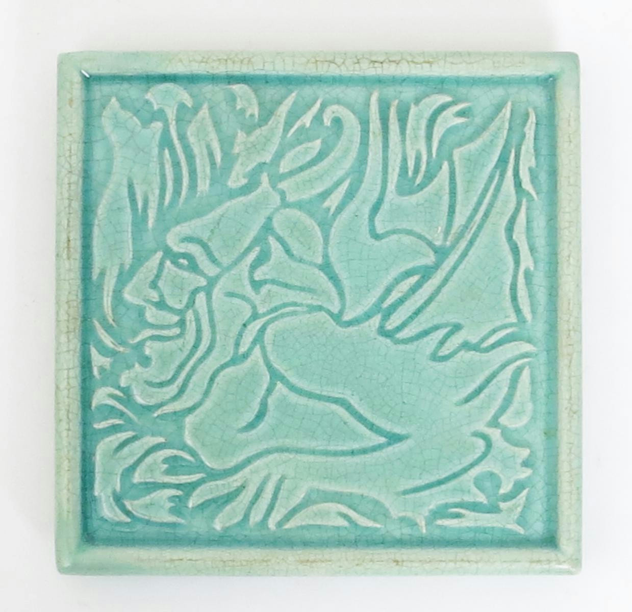 A J.C. Edwards tile stand designed by Charles Francis Annesley Voysey, modelled in low relief with a devil creature glazed pale blue impressed marks, professionally restored, 16cm. square