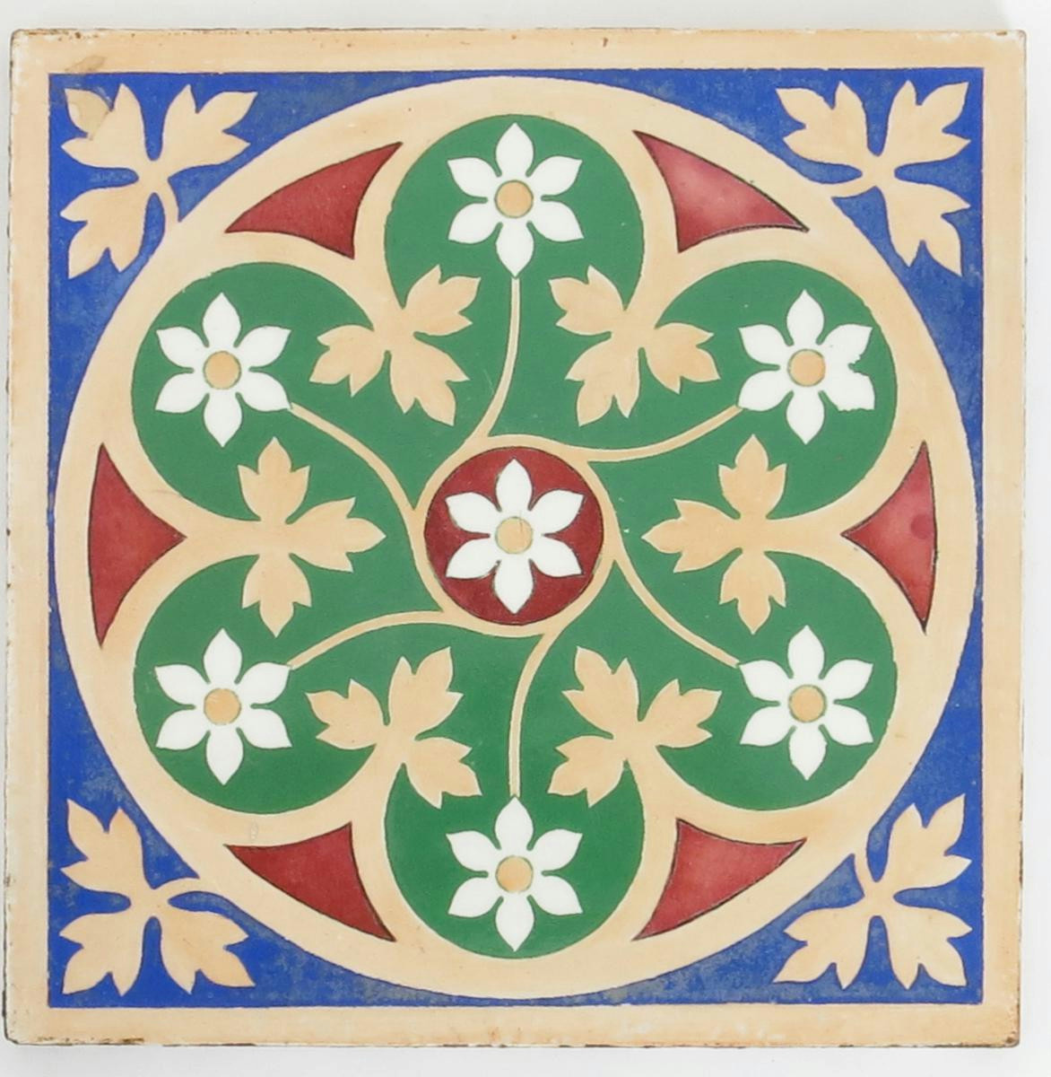A Minton's tile the design attributed to A.W.N Pugin, based on the Viola Martia Purpurea design, printed with a stylised flower roundel in shades of green, red, pink, blue and white, impressed grid back 20.5cm. square