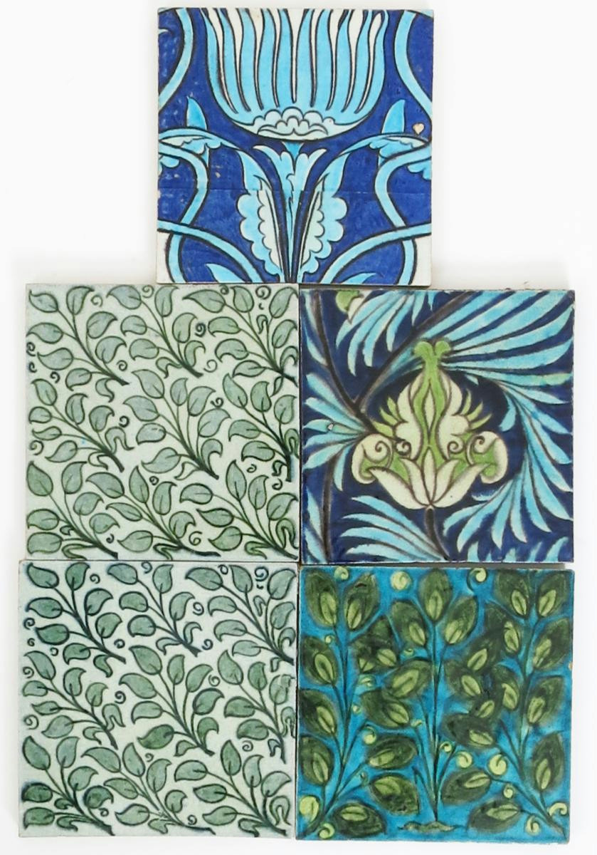 Two William De Morgan Merton Abbey Flying Leaf tiles, painted in green on a white ground, and three various William De Morgan foliate tiles impressed marks, 15cm. square