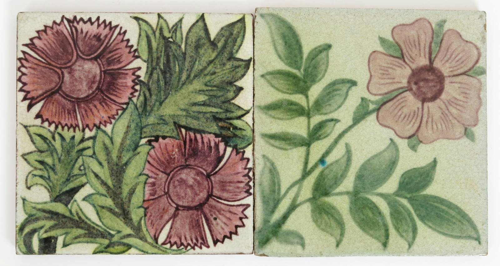 A William De Morgan Merton Abbey Single Rose tile, painted in shades of pink and green on an off white ground, and a William De Morgan KL Rose tile on Poole Architectural blank impressed marks 15.5cm. square