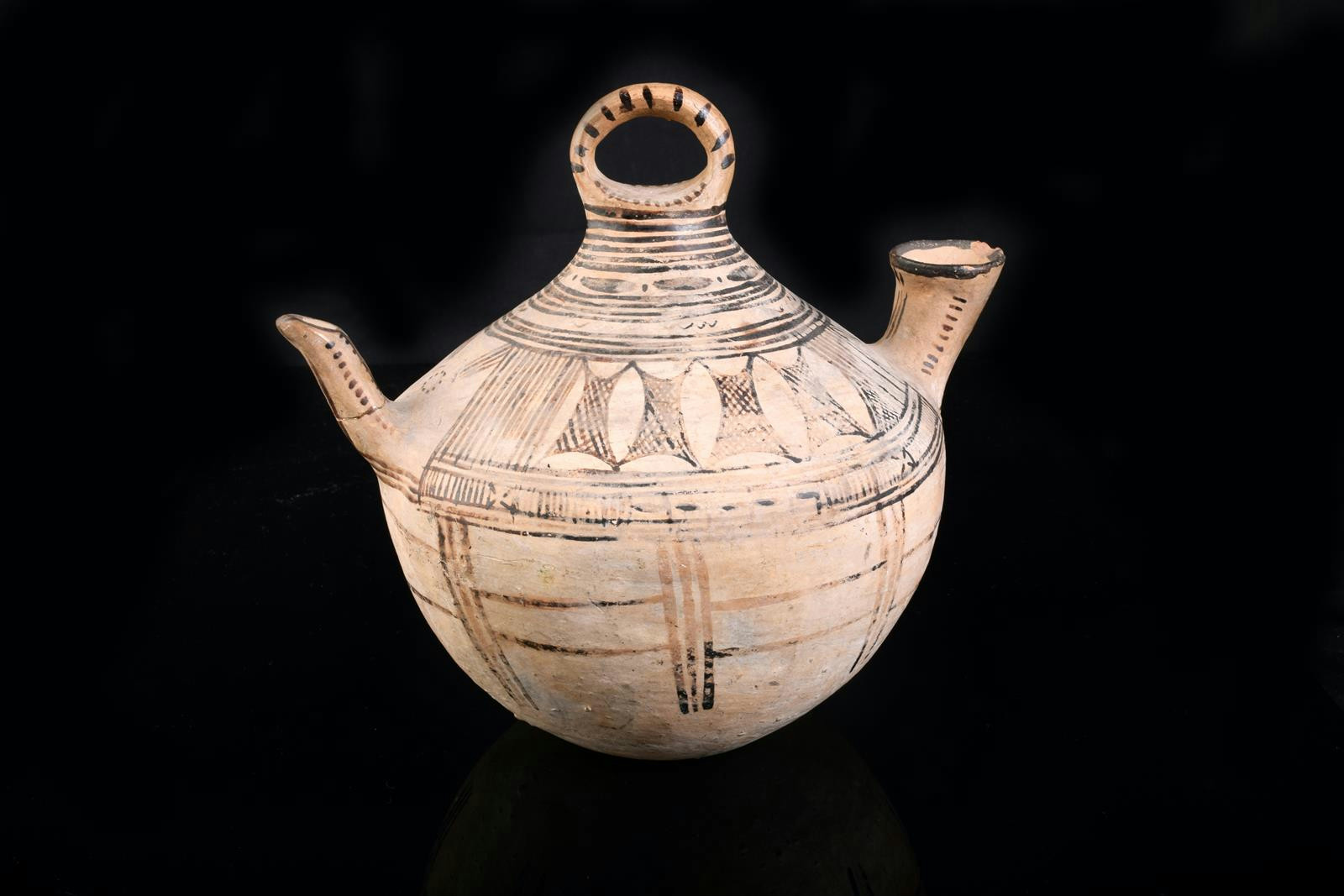 A Daunian ware askos, painted with geometric decoration in dark umber, 23cm high, 5th - 4th century B.C.