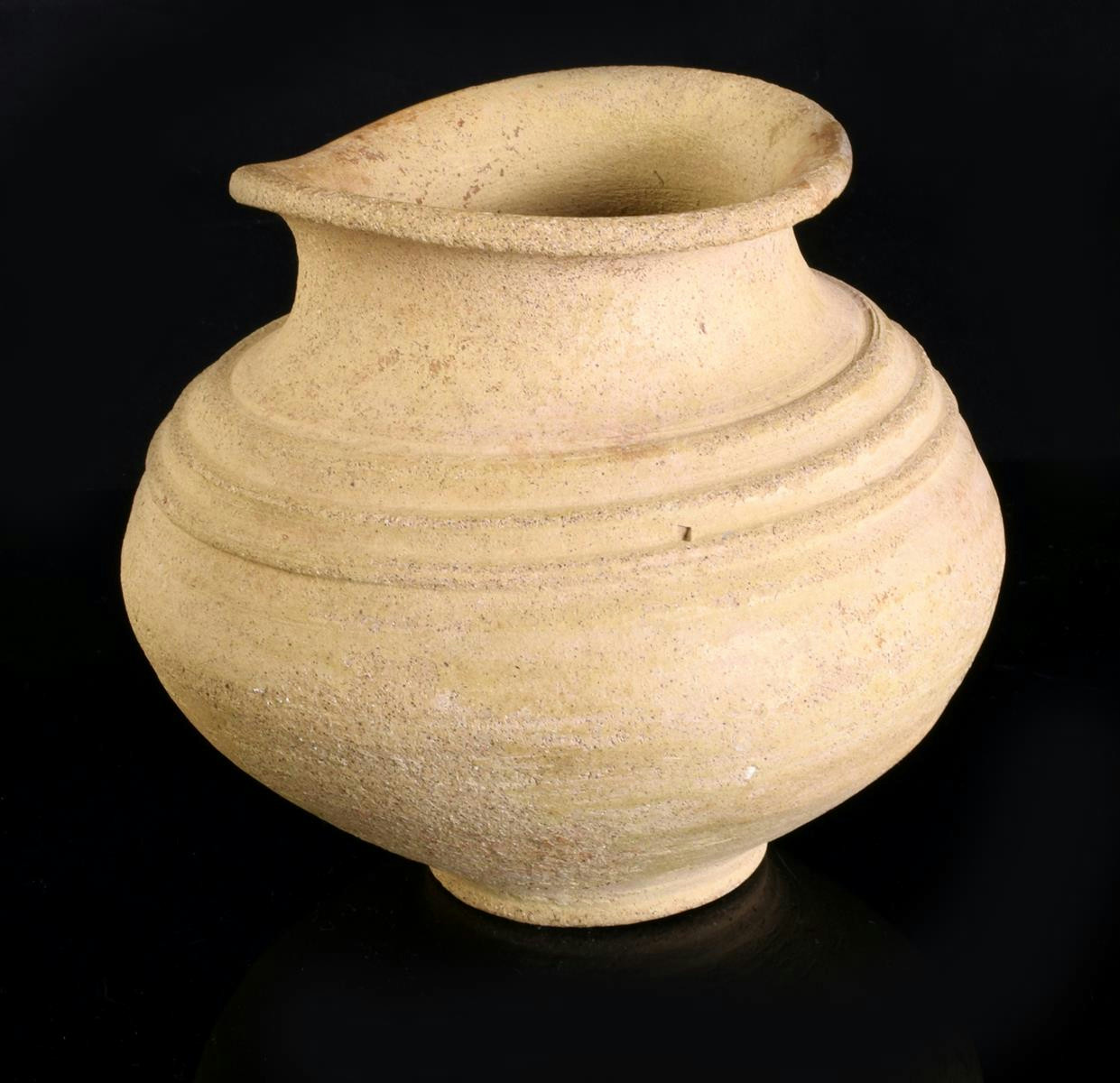 A Roman pottery coin vessel, of bulbous form with ribbed shoulder and a wavy rim, possibly 3rd century, 15.5cm high.