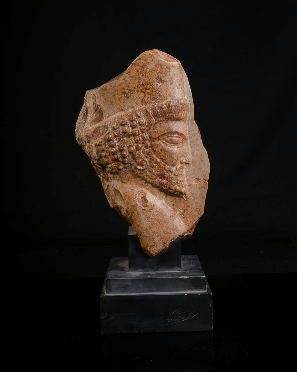 An Achaemenid style relief fragment, depicting the bust of a bearded man, 19th / 20th century, 26.5cm high, mounted on a slate stand.