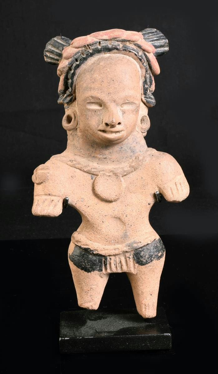A Vera Cruz pottery standing figure, wearing a feathered headdress, earrings, a pendant necklace and a loin cloth, with black bitumen highlights, 17cm high, with later stand. (2)