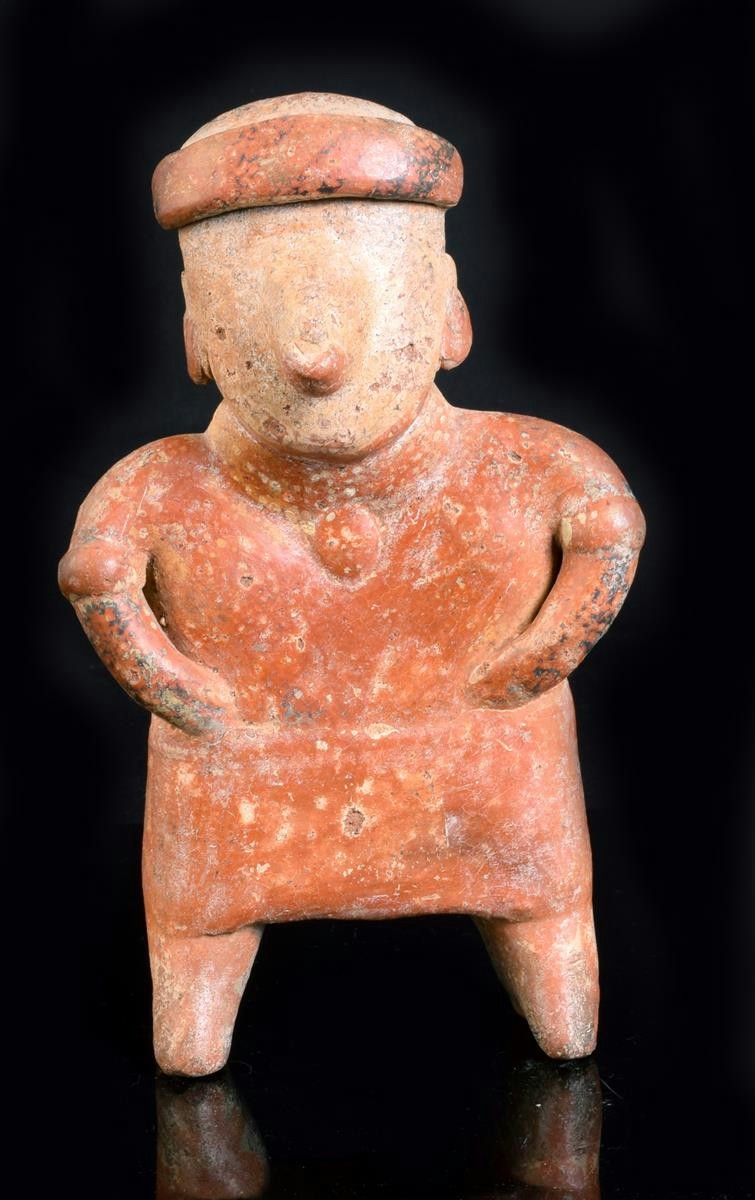 A Nayarit terracotta standing figure, wearing a hat and a pendant necklace, with arms into waist, 20.5cm high.