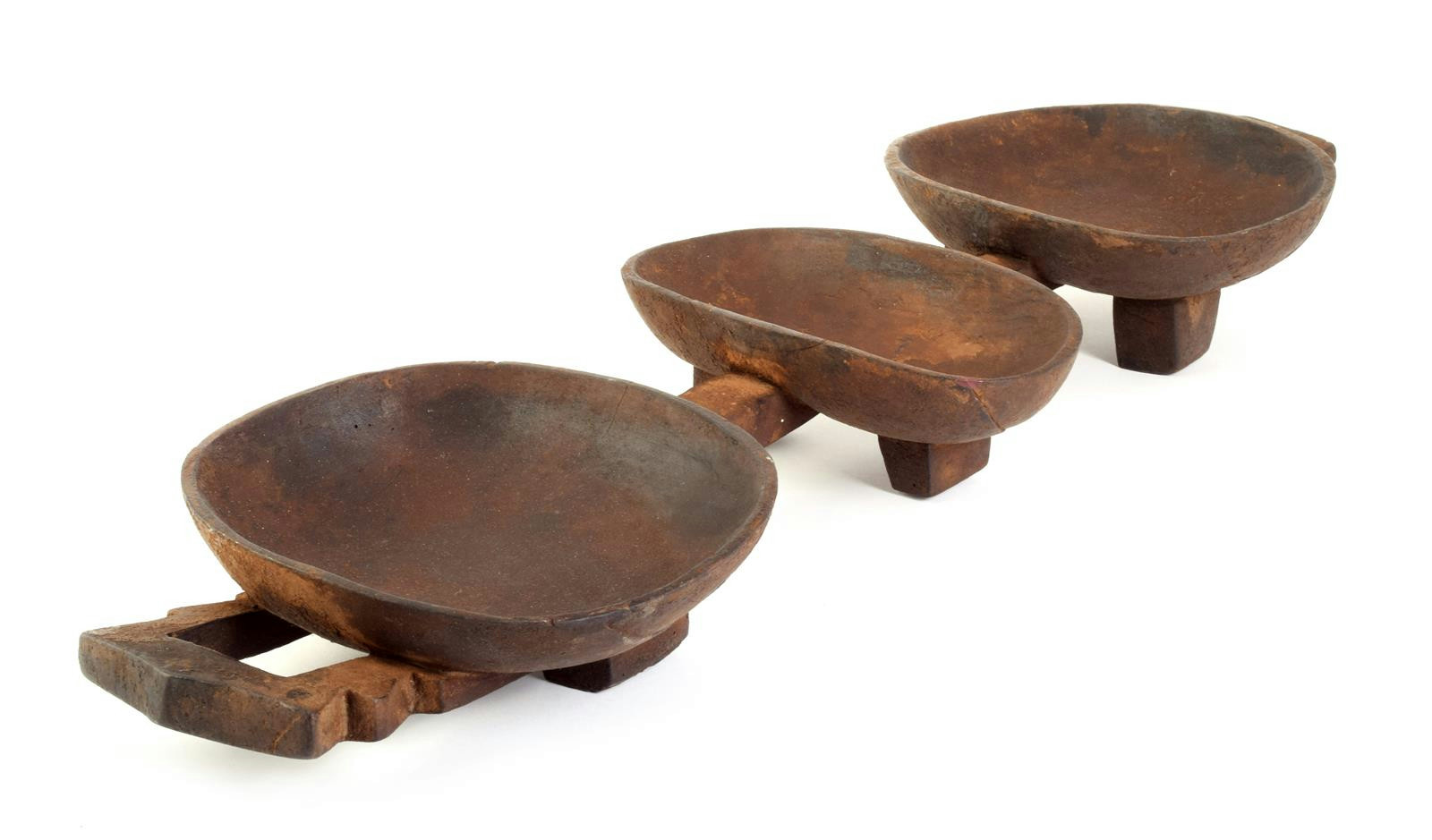 A rare Zulu platter, with three bowls, the underside with relief decoration, with open handles and lug feet, 63cm long.