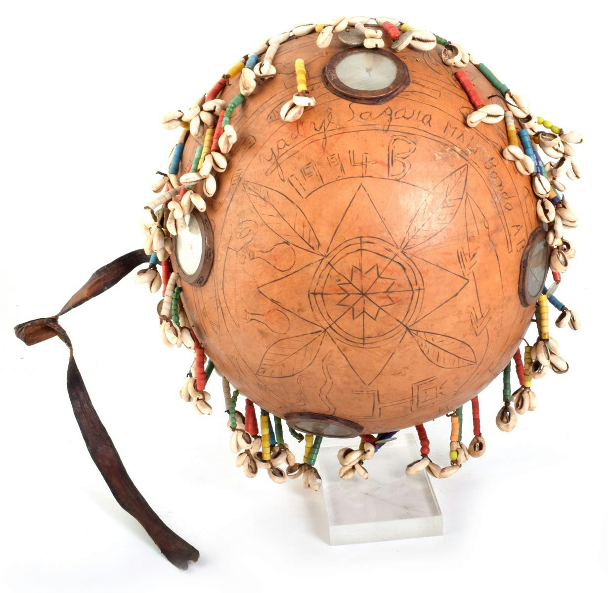 A Mali calabash, the U shaped gourd body decorated leaves, figures, fish, birds, a donkey inscribed 'Yadiye sagara Mali Bondo AB, 1994B', with inset mirror panels, with shells and beads and leather strap, 38cm diameter.