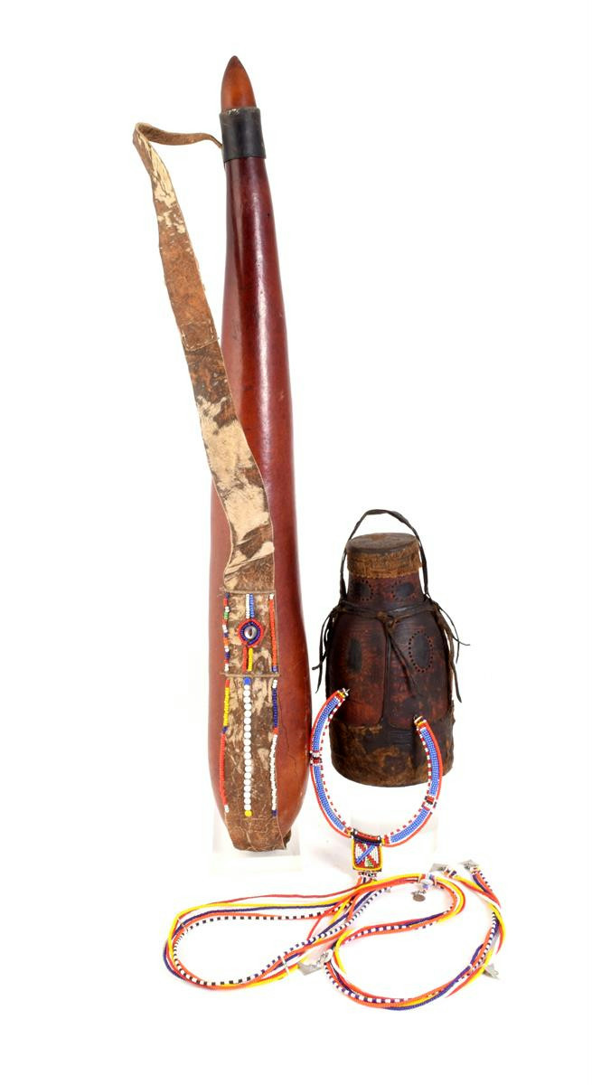 A Kenyan long milk gourd, with leather and beadwork handle, 84.5cm high, a wood and hide covered container, 26cm high and a Kenyan beadwork necklace with aluminum pendants, 148cm long. (3)