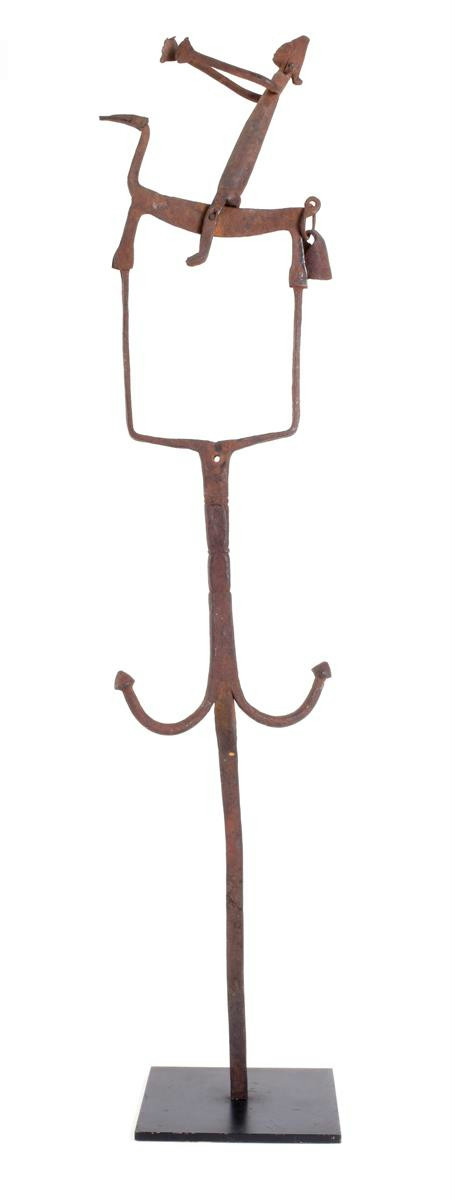 A Bambara iron staff, with an equestrian pivoting figure and bell, 82cm high, on a later stand. (2)
