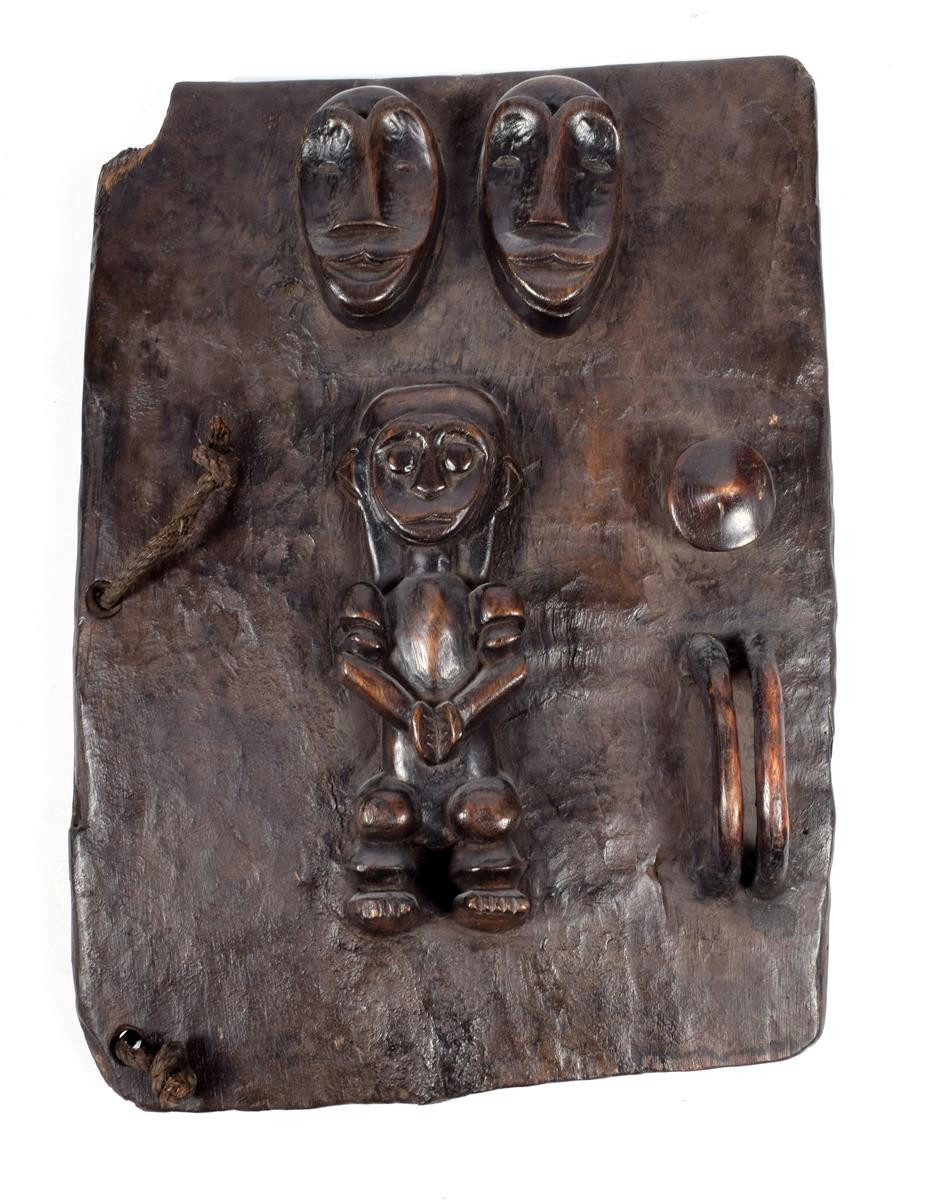 A Fang style carved grain door, with a central standing figure and two masks, with handle, 62.5cm high.
