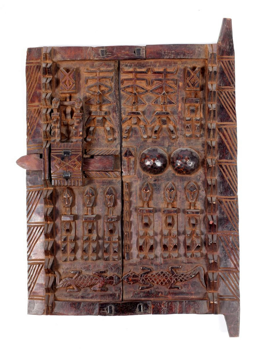 A Dogon carved grain door, with figures and lock, 71cm high.