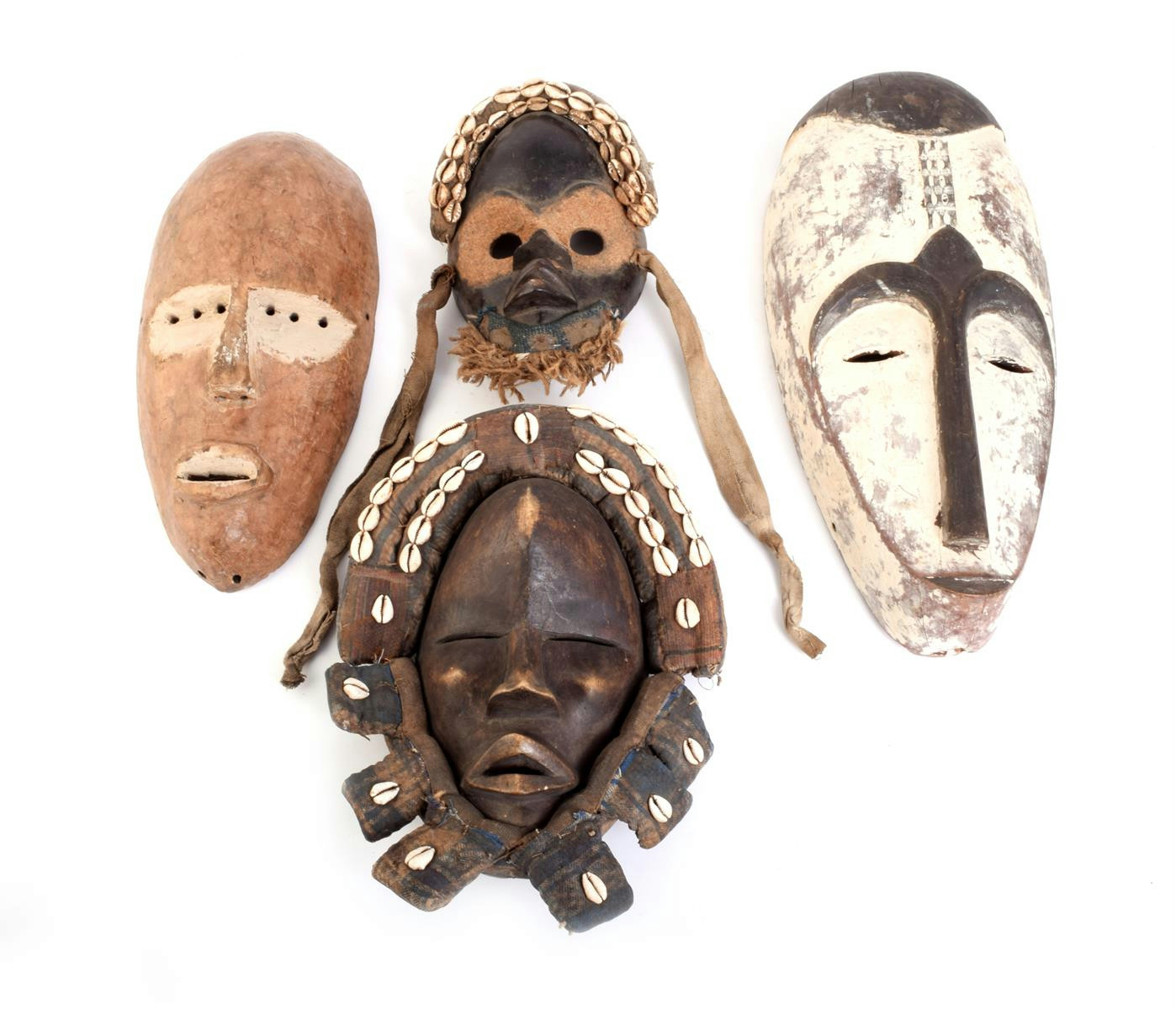 A Fang mask, with applied fibre and shells, 25cm high, a Dan mask with cloth and shell mount, 35cm high, a Fang mask, 45.2cm high and another mask, 38cm high. (4)