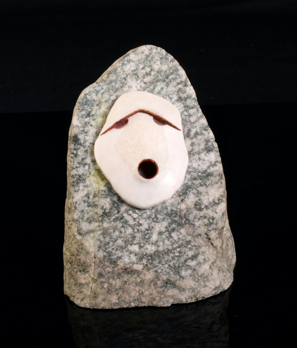 Ayek (Inuit). Evil spirit mask, carved bone mounted on stone, inscribed Ayek '74', 12.5cm high.