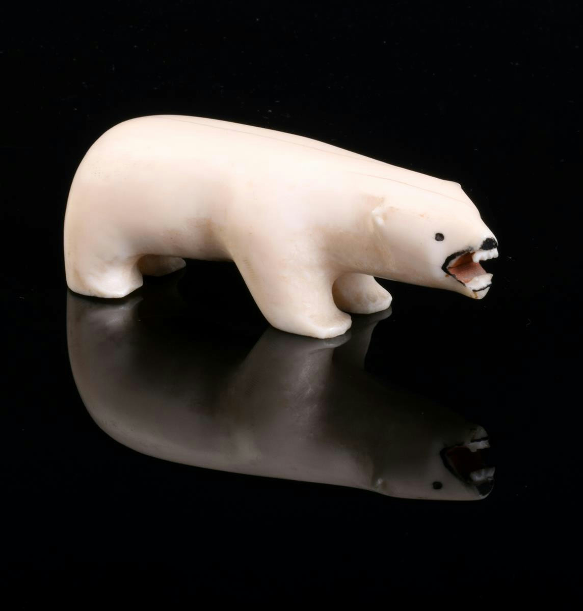 An Inuit carved bone polar bear, with painted mouth and eyes, 9.2cm long.