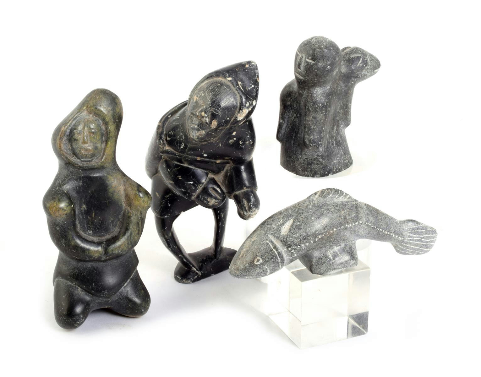 An Inuit carved greenstone fisherman, the underside faintly inscribed, 17.5cm high, an Inuit carved greenstone kneeling figure, the base inscribed, 16.5cm high, an Inuit carved stone figure and seal, 10cm long and an Inuit carved stone fish, the underside inscirbed 'Josie B Papialok C75, 140382', 14.5cm long, Inuit Women Artists edited by Odette Leroux, Marion E Jackson and Minnie Aodla Freeman, 1996 and Inuit Art in the 1970s, 1979. (6)