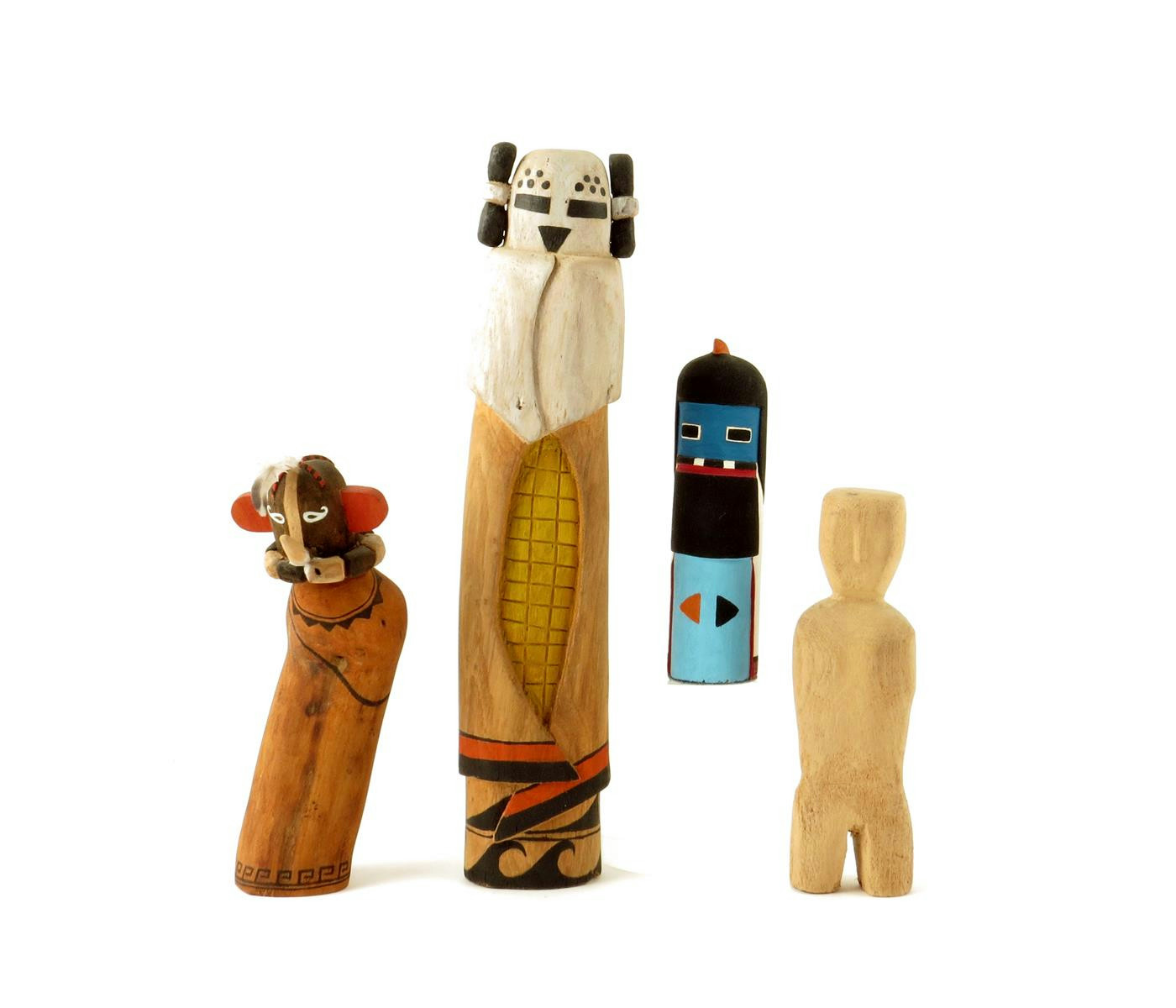 A Hopi Kachina doll, polychrome decorated with a corn body, 33.5cm high, a Hopi doll of bent form, a Hopi doll in blue, black, orange and red and a carved figure. (4)