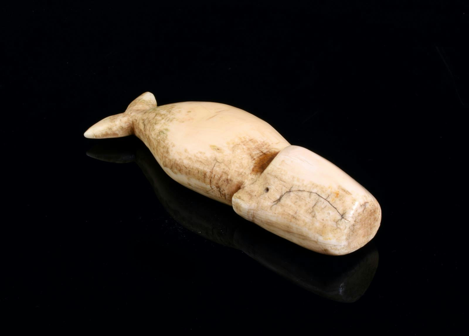 An Inuit carved walrus ivory whale
