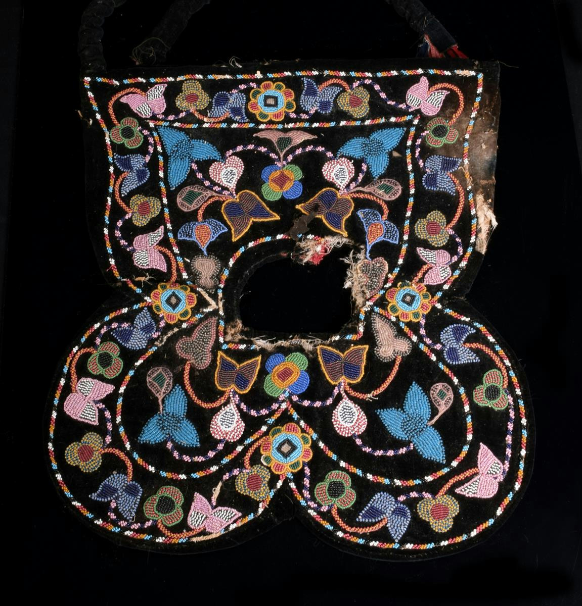 A North American Indian beadwork bag, of unusual shape, with an open arched centre, decorated trailing foliage, 39.5cm wide.