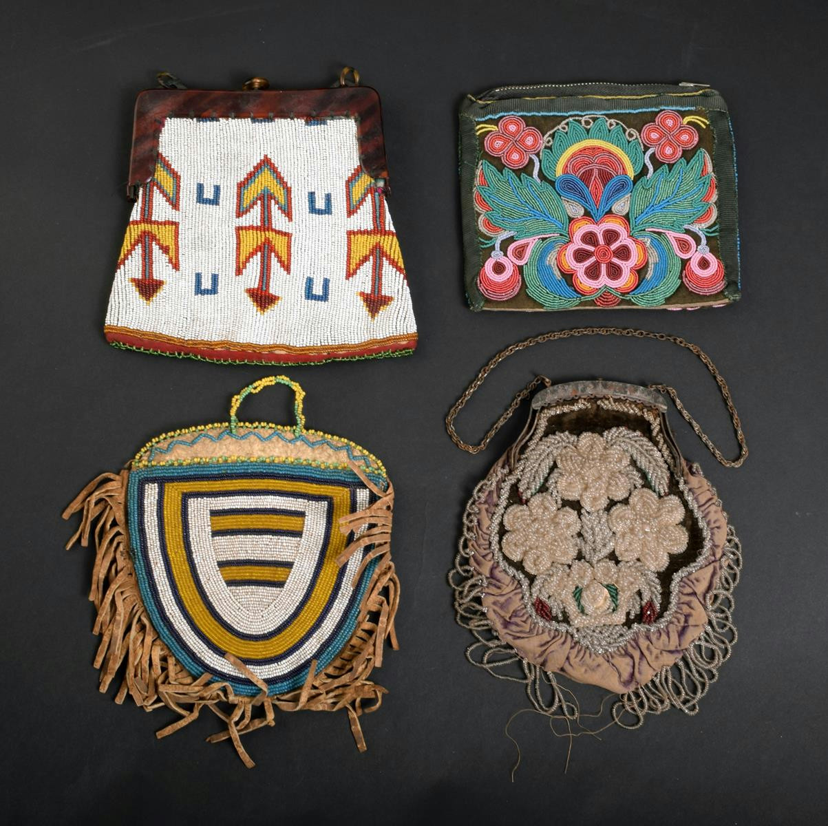 A North American Indian beadwork bag, with mainly clear glass flowers and a steel frame with chain, 16.5cm wide, a U shaped bag, a beadwork bag with zip and a white ground beadwork bag with French faux tortoiseshell mount. (4)