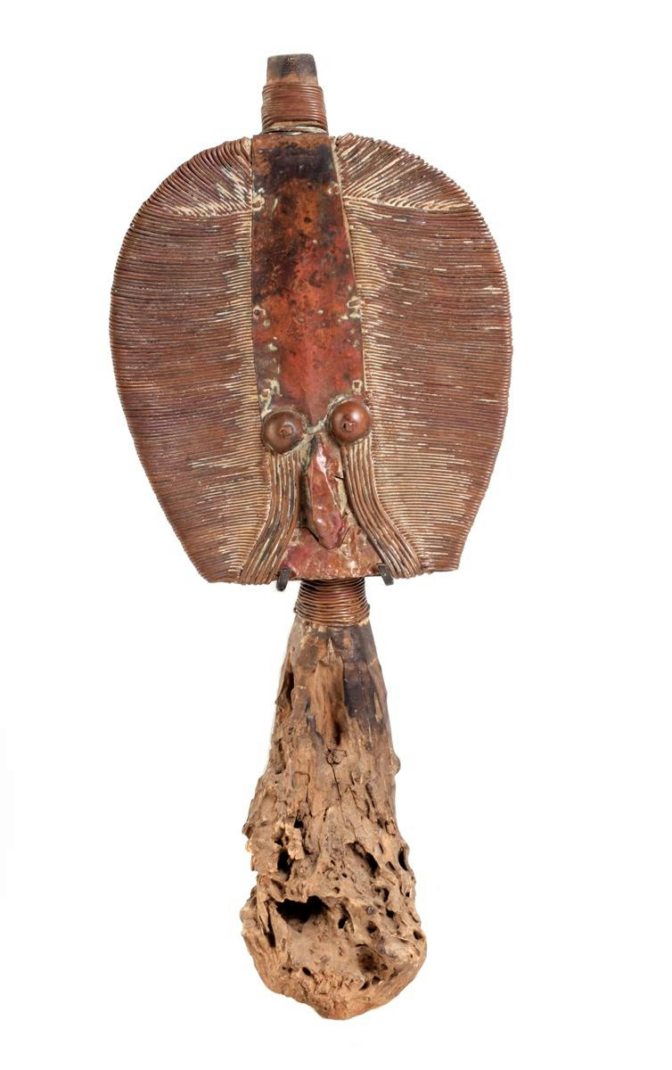 A Mahongwe reliquary figure, with copper wire and sheet decoration, 54cm high, with stand.