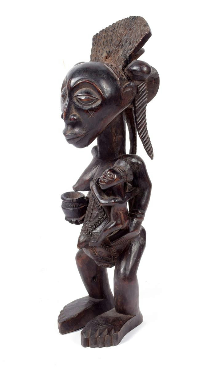 A Luba standing maternity figure, with child and bowl, 54.5cm high.