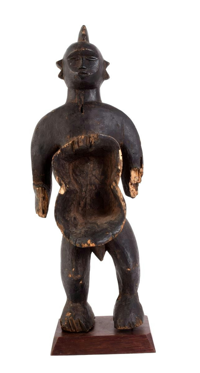 A West African standing male figure, with a single cresting and a shaped abdomen bowl, with inventory number 'RC 1614,' 54.5cm high, on a base. (2)