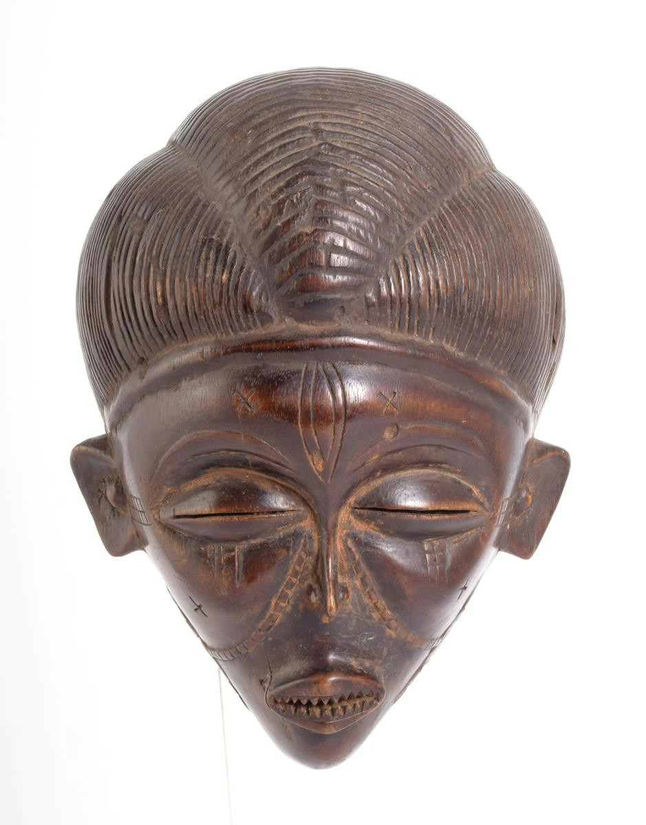 A Chokwe mask, with ribbed coiffure, scarifications and filed teeth, 21cm high.
