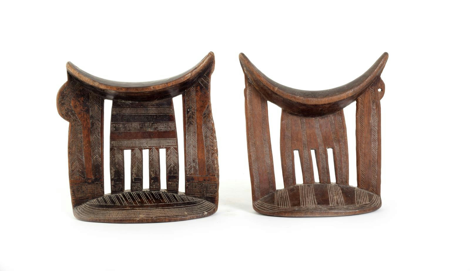 An Ethiopian headrest, with pierced and incised decoration, 20.5cm high and a similar Ethiopian headrest with pierced hole to one side, 20cm high. (2)
