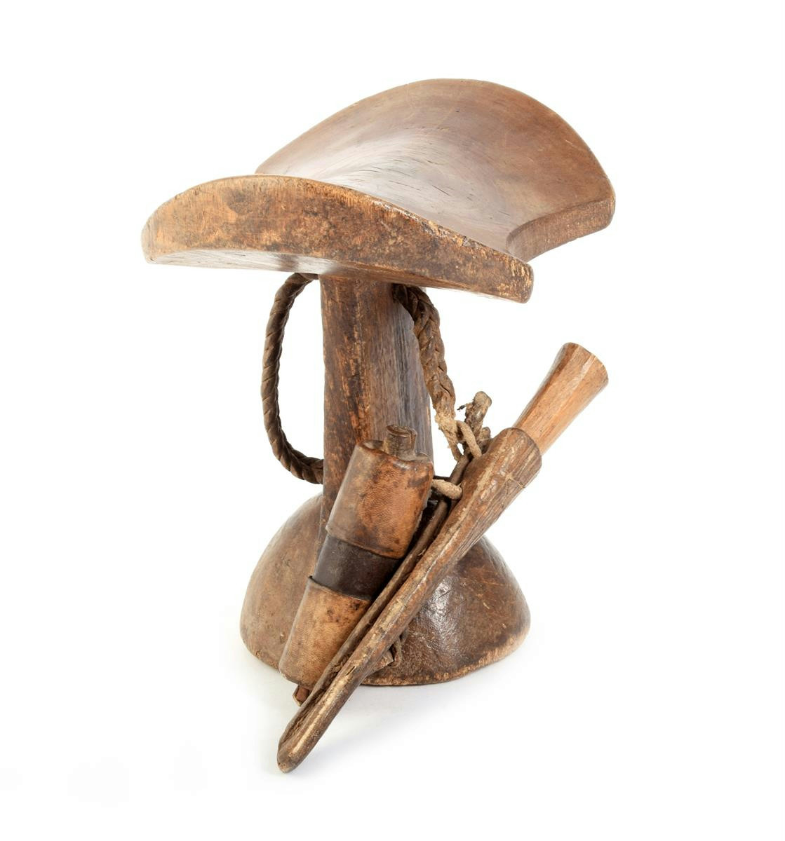 An Ethiopian headrest, 18.5cm high, with attached knife and metal and leather cylindrical container.